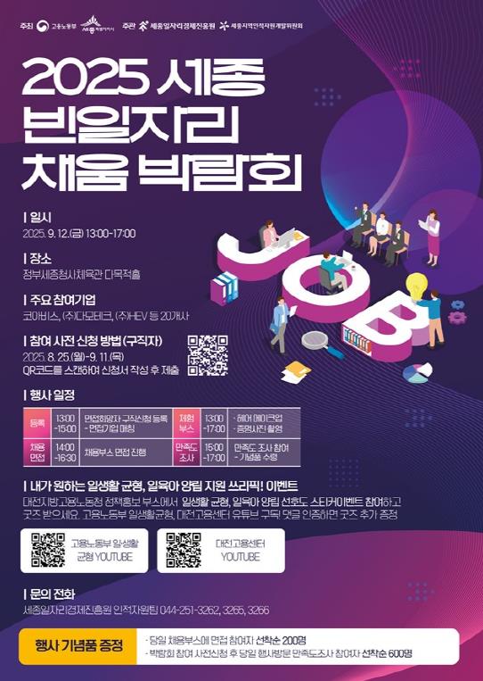 [뉴스시대=김정희 기자] 세종일자리경제진흥원은 오는 9월 12일 ‘2025년 세종 빈일자리 채움 박람회’를 개최한다. 이번 박람회는 세종시 뿌리산업과 전문과학기술업 기업의 인력난 해소와 지역 구직자의 취업 기회 확대를 위해 마련됐다.