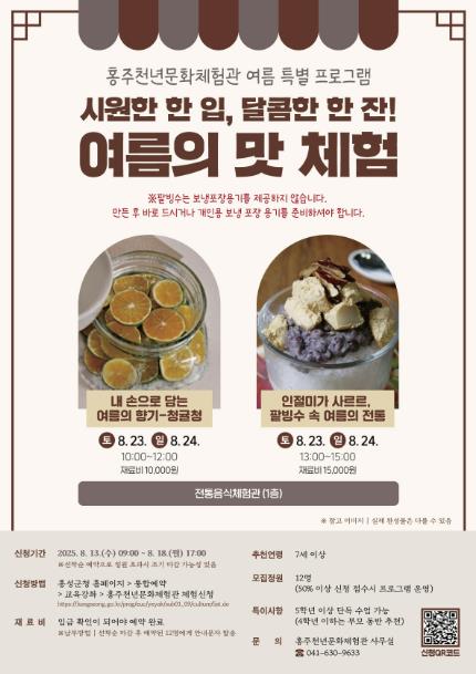 [뉴스시대=김정희 기자] 홍성군 홍주천년문화체험관은 무더운 여름을 시원하게 보낼 수 있도록 오는 23일부터 24일까지 양일간 여름 특별 프로그램 ‘시원한 한 입, 달콤한 한 잔! 여름의 맛 체험’을 운영한다고 밝혔다.