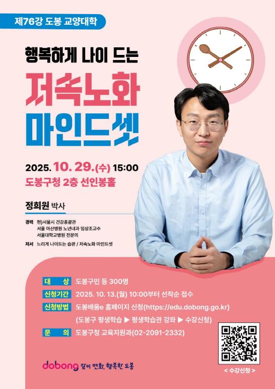 [뉴스시대=김정희 기자] 서울 도봉구가 10월 13일 오전 10시부터 ‘저속노화 마인드셋’ 특강 참여자를 모집한다.