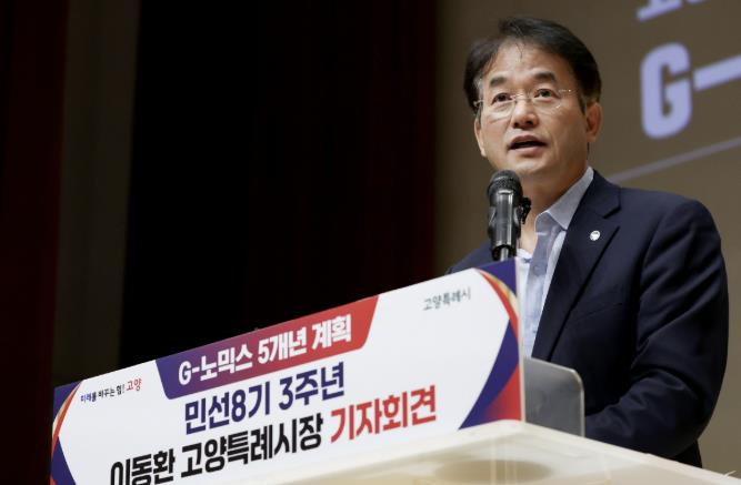 ▲ 이동환 고양특례시장(AI·로봇·빅데이터 자급자족하는 계획‘AI 노믹스’를 담은 민선8기 3주년 기자회견) |
