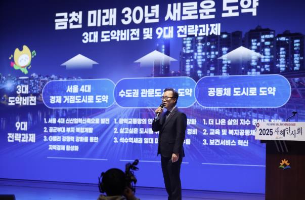 ▲ 유성훈 금천구청장이 2025 새해인사회 행사에서 ‘금천 미래 30년’을 발표하고 있다.