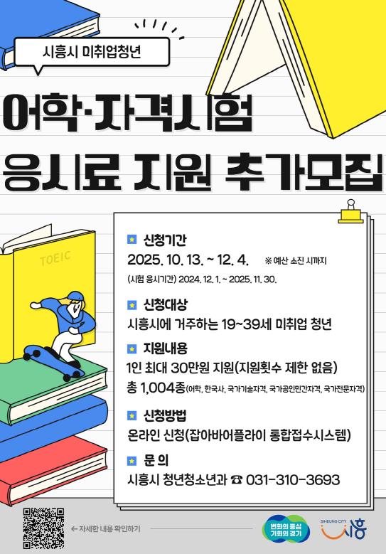 [뉴스시대=김정희 기자] 시흥시는 10월 13일부터 관내 취업 준비 청년들의 능력개발을 돕기 위한 어학ㆍ자격시험 응시료 지원 3차 모집을 실시한다.