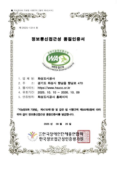 한병홍 HU공사 사장은 “앞으로도 사회적 약자를 배려하는 디지털 환경 조성에 앞장서겠다”며 “모든 시민이 공사의 정보를 쉽고 편리하게 접할 수 있도록 대시민 서비스 개선에 최선을 다하겠다”고 밝혔다.
