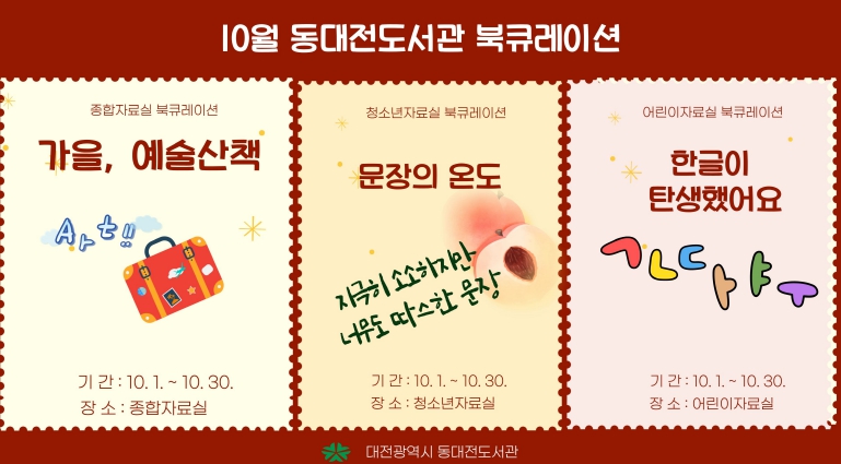 [뉴스시대=김정희 기자] 동대전도서관은 가을 독서의 계절을 맞아 10월 한 달간 연령별 맞춤 주제 북큐레이션 전시를 운영한다고 10일 밝혔다.