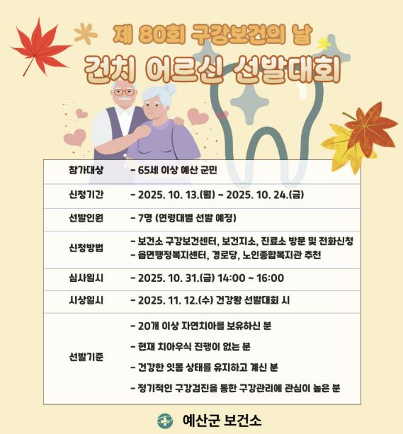 [뉴스시대=김정희 기자] 예산군보건소는 ‘제80회 구강보건의 날’을 맞아 건강하고 활기찬 구강생활 실천 분위기 조성을 위해 건치(건강한 치아)어르신 선발대회를 개최한다.