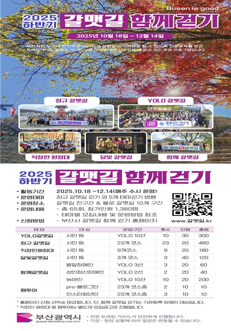 [뉴스시대=김정희 기자] 부산시는 오는 10월 18일부터 12월 14일까지 두 달여 간 '2025년 하반기 욜로(YOLO) 갈맷길 함께 걷기 행사'를 운영한다고 밝혔다.