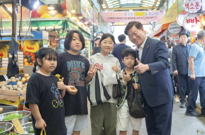 ▲ 박승원 광명시장이 지난 9월 30일 광명새마을시장을 찾은 아이들과 기념사진을 촬영하고 있다. |