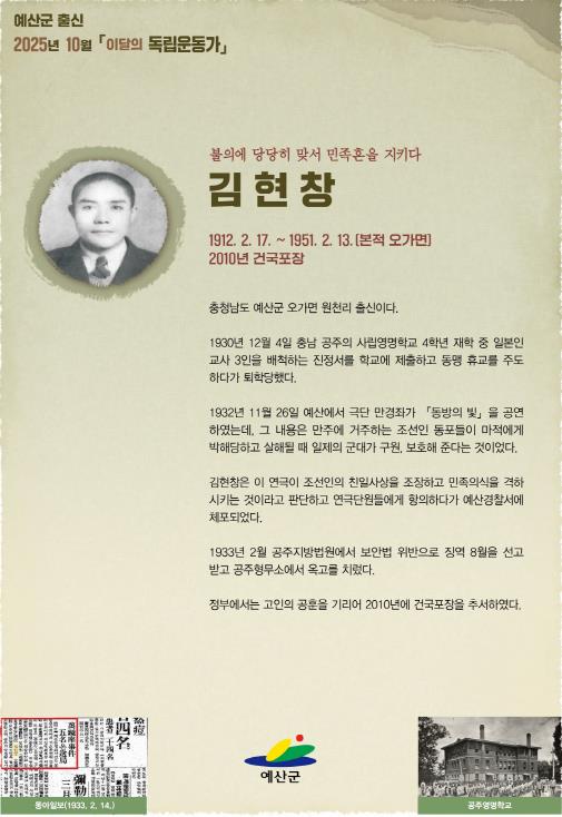 ▲ 2025년 10월 이달의 독립운동가 포스터(김현창) |