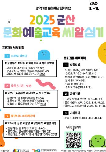 [뉴스시대=김정희 기자] 군산문화관광재단이 2025년 광역-기초문화재단 협력사업인 [군산 문화예술교육 씨-앝(art) 심기]의 참여자를 모집한다.