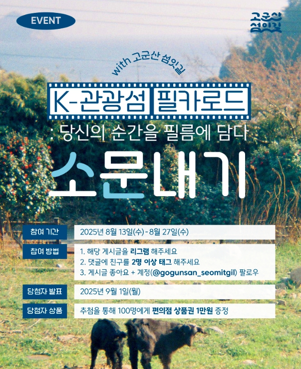 8월 고군산섬잇길 다달이 이벤트 ’K-관광섬 필카로드 행사 소문내기’에 참여하려면, 고군산섬잇길 공식 사회관계망(SNS)을 팔로우 한 후 댓글에 친구를 소환하고, 해당 게시물을 리그램하면 된다.