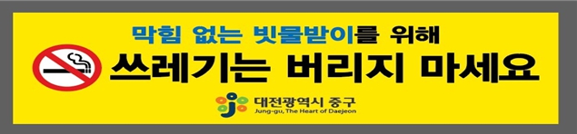[뉴스시대=김정희 기자] 대전 중구는 쾌적한 도시환경 조성과 빗물받이 악취 저감을 위해 대흥동, 오류동, 은행동 먹자골목 등 관내 주요 지역 빗물받이 주변 250개소에‘막힘없는 빗물받이 만들기’안내표지를 이달 말까지 부착한다고 밝혔다.