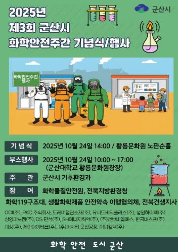 [뉴스시대=김정희 기자] ‘화학사고 없는 안전도시 군산’ 실현을 위해 오는 10월 20일부터 24일까지‘제3회 군산시 화학안전주간’행사가 열린다.