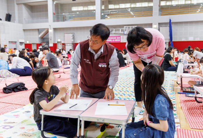 ▲ 박강수 마포구청장이 그림 그리기 대회에 참석한 어린이와 인사하고 있다. |