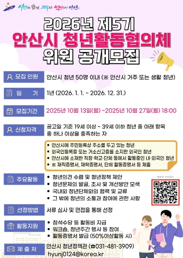 [뉴스시대=김정희 기자] 안산시는 오는 27일까지 ‘제5기 안산시 청년활동협의체’ 위원 50명을 공개 모집한다고 15일 밝혔다.