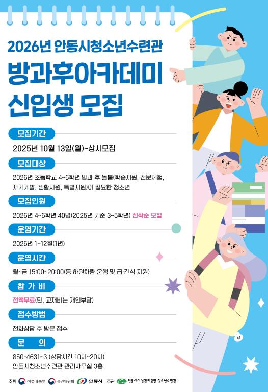 [뉴스시대=김정희 기자] 안동시시설관리공단이 운영하는 청소년수련관 방과후아카데미가 오는 10월 13일부터 2026년도 신입생 모집을 시작한다.