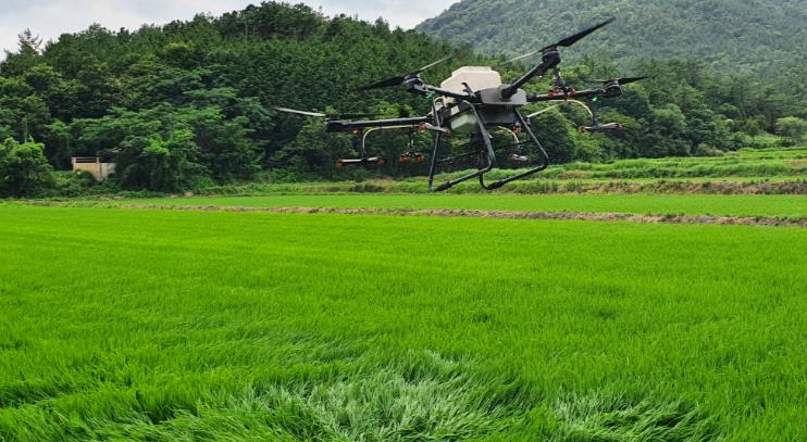 ▲ 벼 재배포장에서 드론을 이용해 이삭거름을 살포하는 모습 |