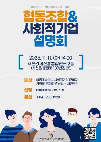 [뉴스시대=김정희 기자] (재)서천군지속가능지역재단은 오는 10월 20일 오후 2시, 서천경제진흥통합센터에서 ‘협동조합·사회적기업 설명회’를 연다.
