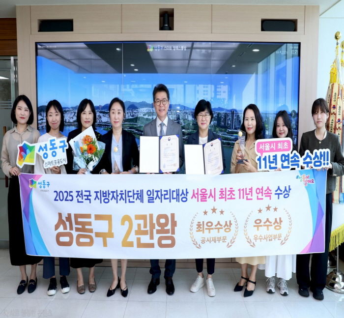 [뉴스시대=김정희 기자] 서울 성동구가 ‘2025년 전국 지방자치단체 일자리대상’에서 공시제 부문 ‘최우수상’과 우수사업 부문 ‘우수상’을 수상하며 2관왕 달성과 동시에 2015년부터 11년 연속 수상이라는 대기록을 세웠다고 밝혔다.