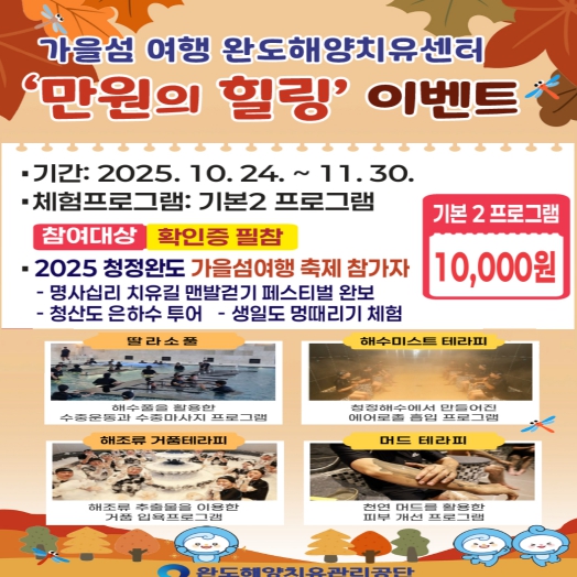 [뉴스시대=김정희 기자] 완도해양치유센터에서 10월 24일부터 26일까지 개최되는 ‘2025 청정 완도 가을 섬 여행’과 연계하여 ‘만원의 힐링’ 이벤트를 진행한다.