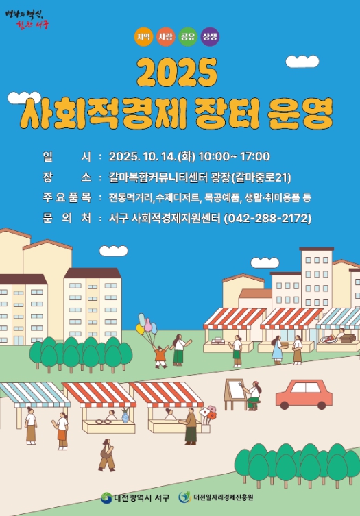 [뉴스시대=김정희 기자] 대전 서구는 이달 14일 오전 10시부터 오후 5시까지 갈마복합커뮤니티센터 광장에서 지역·사람·공유·상생을 주제로 한 ‘2025 사회적경제장터’를 운영한다.