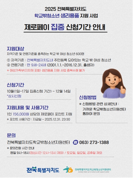 [뉴스시대=김정희 기자] 전북특별자치도가 경제적 부담을 겪는 학교 밖 여성청소년들을 대상으로 생리용품을 지원하는‘2025년 학교 밖 여성청소년 건강지원사업’을 추진한다.