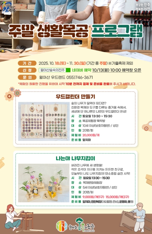 시 관계자는 “생활목공은 단순한 만들기를 넘어 숲과 목재의 가치를 배우고, 이를 생활 속 친환경 실천으로 확장할 수 있는 의미 있는 체험이다”면서 “많은 시민들이 주말에 가족과 함께 참여해 목재가 지닌 특별한 매력과 의미를 느끼고, 지속가능한 생활문화를 만들어가길 바란다”고 전했다.