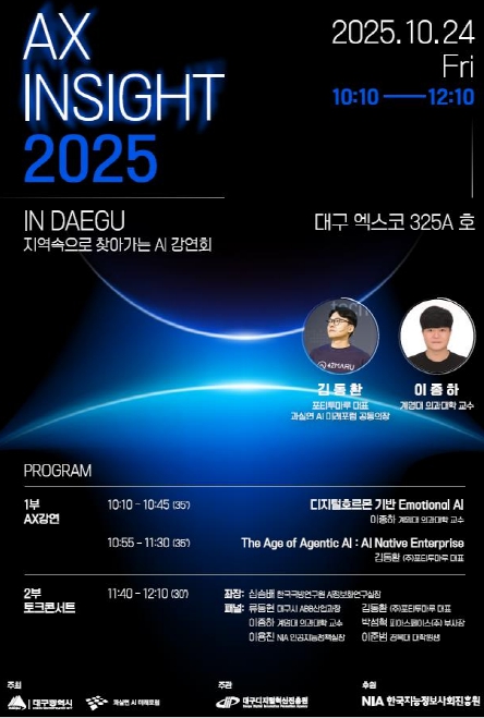 [뉴스시대=김정희 기자] 대구광역시는 (사)과실연 AI미래포럼과 함께 10월 24일(금) 대구 엑스코에서 ‘AX·Security Insight 2025 In Daegu’를 개최한다.
