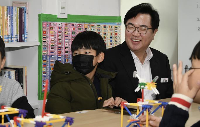 ▲ 박일하 동작구청장이 지난해 12월 서울 동작구 사당3동 우리동네키움센터에서 ‘AI 로봇 발명 메이커 대회’ 수상 아동들과 대화를 나누고 있다. |