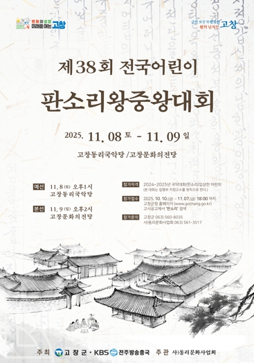 [뉴스시대=김정희 기자] 전북 고창군이 올해의 어린이 판소리 왕중왕을 가리는 ‘제38회 전국 어린이판소리왕중왕대회’ 참가자를 오는 11월7일까지 모집한다.