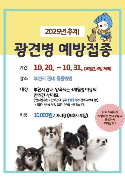 예방접종 대상은 동물등록이 완료된 생후 3개월 이상 반려견과 반려묘다. 접종을 희망하는 부천시민은 반려동물을 동반해 관내 지정 동물병원을 방문하고, 1만 원을 납부하면 광견병 백신을 접종받을 수 있다.