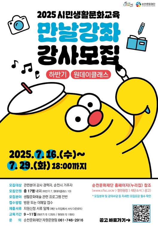 [뉴스시대=김정희 기자] (재)순천문화재단은 시민들의 생활문화예술 활동을 장려하고 지원하기 위해 2025년 시민생활문화교육 「만날강좌」 강사를 오는 29일 오후 6시까지 모집한다.