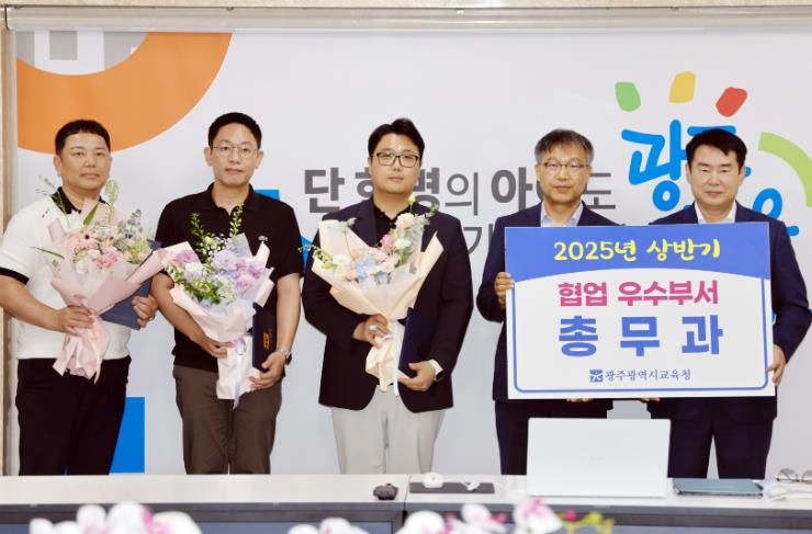 ▲ 이정선 광주시교육감(오른쪽 첫 번째)이 14일 본청 상황실에서 열린 확대간부회의에서 상반기 '우수 협업 직원'으로 선정된 한창호, 권성택, 백승현 주무관(왼쪽부터)과 '우수부서' 총무과 임창호 과장에 대해 표창을 수여하고 있다.