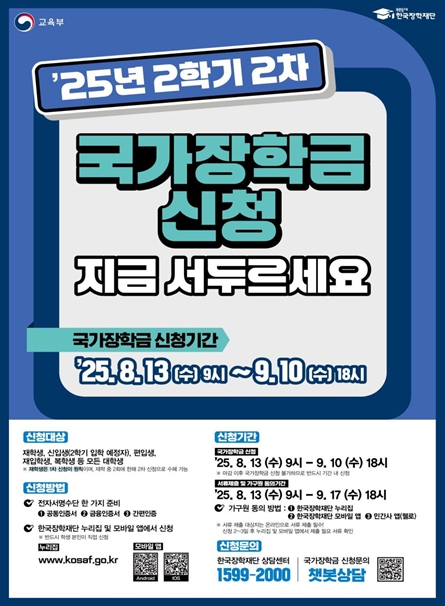 [뉴스시대=김정희 기자] 교육부와 한국장학재단은 8월 13일 9시부터 9월 10일 18시까지 ‘2025학년도 2학기 2차 국가장학금 통합 신청’을 받는다고 밝혔다.