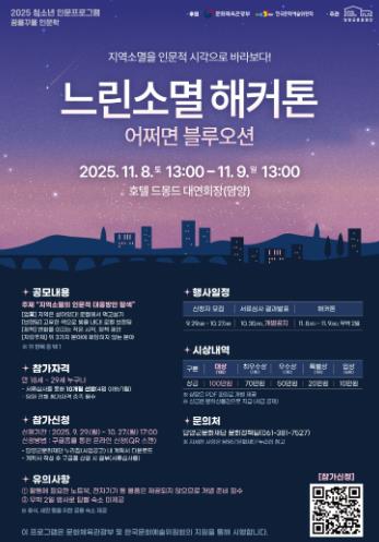 [뉴스시대=김정희 기자] 담양군문화재단은 오는 11월 8일부터 9일까지 지역소멸 대응 인문사회적 문제해결방안을 탐색하는 「느린소멸 해커톤」을 개최한다고 밝혔다.