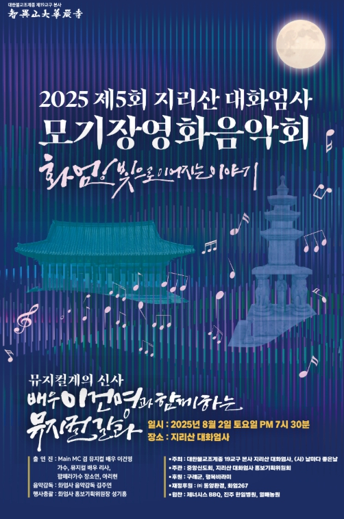 [뉴스시대=김정희 기자] 대한불교조계종 19교구 지리산대화엄사 교구장 우석스님은 2025년 제5회 지리산 대화엄사 모기장 영화음악회 “뮤지컬계의 신사 이건명 배우와 함께하는 뮤지컬 갈라”를 8월 2일 토요일 저녁 7시 30분 100분 동안 화엄원 특설 무대에서 개최한다고 밝혔다.