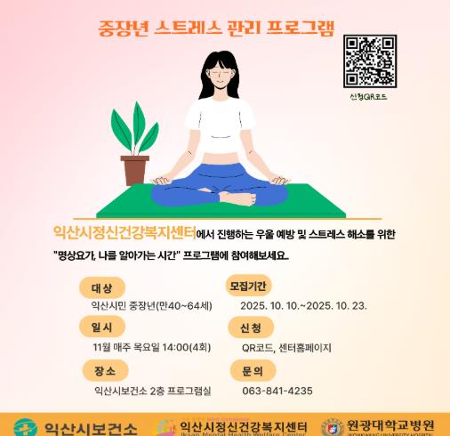 [뉴스시대=김정희 기자] 익산시정신건강복지센터는 만 40~64세 중장년을 대상으로 '마음힐링 명상요가' 프로그램을 운영한다고 10일 밝혔다.