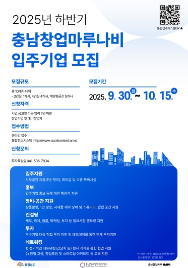 [뉴스시대=김정희 기자] (재)충남창조경제혁신센터는 오는 10월 15일까지 2025년 하반기 충남창업마루나비 입주기업을 모집한다고 밝혔다. 이번 모집은 혁신적인 아이디어와 성장 잠재력을 지닌 스타트업을 발굴해 안정적인 보육 환경을 제공하고, 기업의 지속적인 성장을 지원하기 위해 추진된다.
