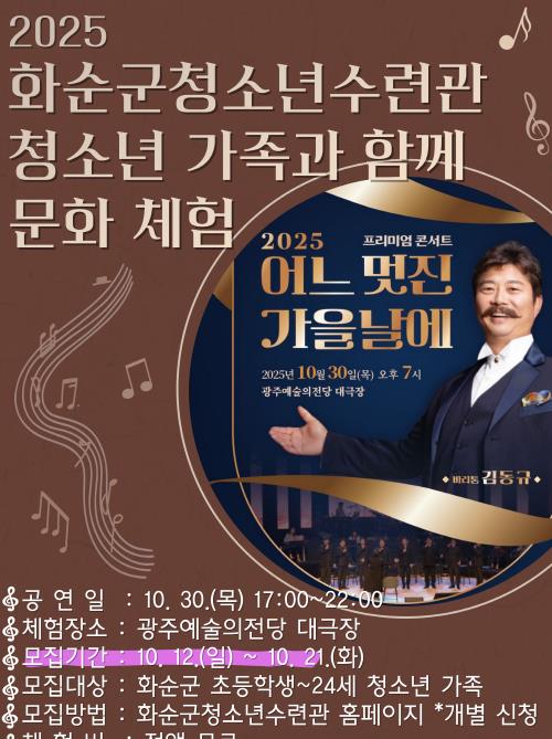 [뉴스시대=김정희 기자] 화순군은 2일 청소년수련관에서 짙어가는 가을의 정취 속에 청소년과 가족이 함께하는 특별한 문화체험, 바리톤 김동규의 프리미엄 콘서트'어느 멋진 가을날'을 관람할 청소년 가족 60명을 선착순 모집한다고 밝혔다.
