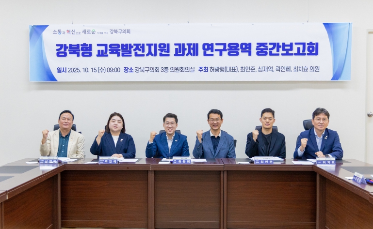 [뉴스시대=김정희 기자] 강북구의회 의원연구단체인 ‘강북형 교육발전지원 연구회’ (대표의원 허광행)는 지난 10월 15일 의회 3층 의원회의실에서 중간보고회를 열었다.