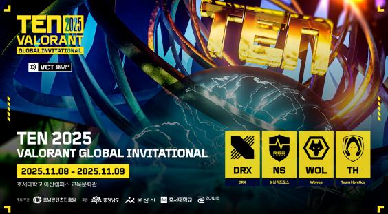 [뉴스시대=김정희 기자] (재)충남콘텐츠진흥원은 글로벌 인기 FPS 게임 발로란트(VALORANT)의 프로 초청 대회 ‘TEN 2025 VALORANT Invitational’이 오는 11월 8일부터 9일까지 충남 아산 호서대학교 아산캠퍼스 교육문화관에서 개최된다고 밝혔다.