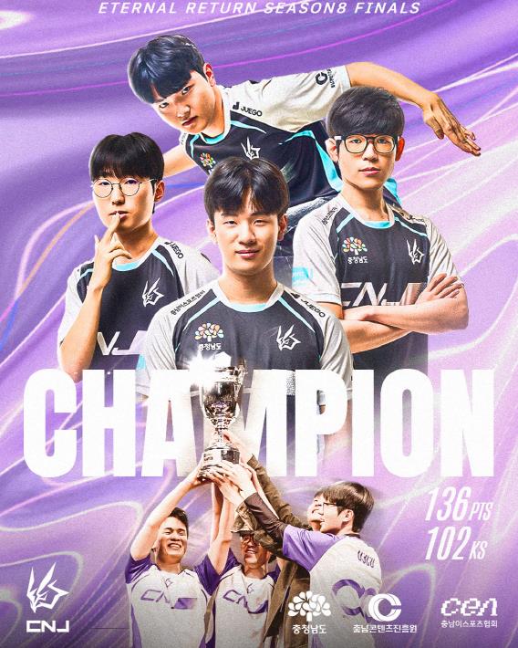 [뉴스시대=김정희 기자] (재)충남콘텐츠진흥원은 충청남도를 대표하는 이스포츠 게임단 ‘CNJ Esports가 2025년 10월 12일 대전 드림 아레나에서 열린 이터널 리턴 마스터즈 시즌8 파이널에서 우승을 차지했다고 밝혔다.