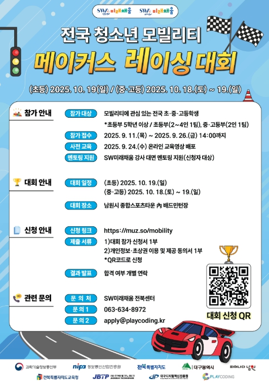 [뉴스시대=김정희 기자] 남원시가 오는 10월 18일부터 19일까지 남원종합스포츠타운 내 배드민턴장에서 ‘SW미래채움(전북) 전국 청소년 모빌리티 메이커스 레이싱 대회’를 개최한다.