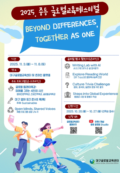 [뉴스시대=김정희 기자] 대구교육연수원 산하 대구글로벌교육센터는 11월 3일부터 8일까지 ‘Beyond Differences, Together as One(차이를 넘어, 하나로)’을 주제로 '2025 중등 글로벌교육페스티벌'을 개최한다.