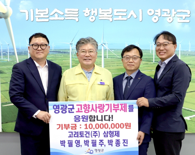 [뉴스시대=김정희 기자] 지난 11일, 고려토건(주) 박필영, 박필주, 박종진 삼형제가 고향사랑기부금 1천만 원을 기탁하여 영광 발전을 위한 따뜻한 나눔을 실천했다.