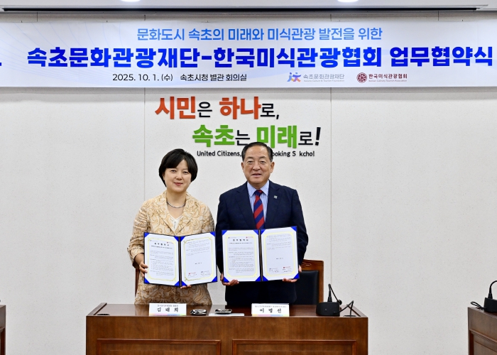 재단법인 속초문화관광재단(이사장 이병선, 속초시장)은 지난 10월 1일 사단법인 한국미식관광협회와 ‘지속 가능한 미식도시 조성을 위한 업무협약’을 체결했다. 이번 협약을 통해 속초는 음식문화와 관광 자원을 연계한 미식 콘텐츠 발굴에 본격적으로 나서며, 문화도시 도전에 속도를 낼 계획이다.