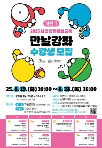 [뉴스시대=김정희 기자] (재)순천문화재단은 시민들의 문화예술 소양을 기르고 생활문화예술 활동을 장려하기 위한 2025년 시민생활문화교육 「만날강좌」 하반기 수강생을 오는 19일 오전 10시부터 28일 오후 4시까지 선착순 모집한다.