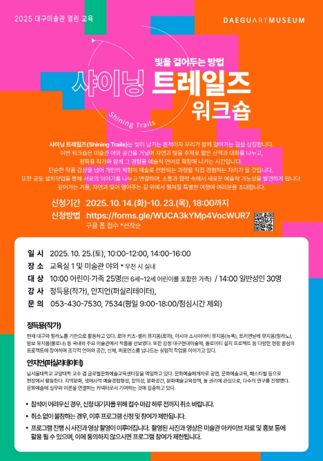 [뉴스시대=김정희 기자] 대구문화예술진흥원 대구미술관은 오는 10월 25일, 오전 10시, 오후 2시, 총 2회에 걸쳐 열린 교육 ‘샤이닝 트레일즈 워크숍: 빛을 걸어 두는 방법’을 운영한다.