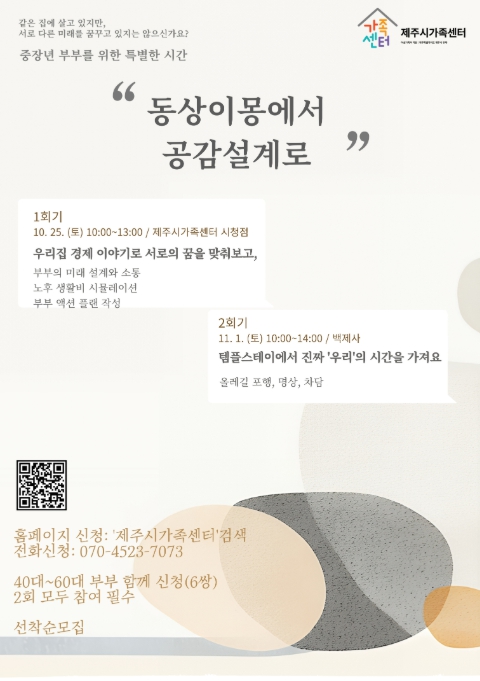 참여를 원하는 부부는 오는 10월 24일까지 제주시가족센터 누리집 또는 전화로 신청하면 된다.