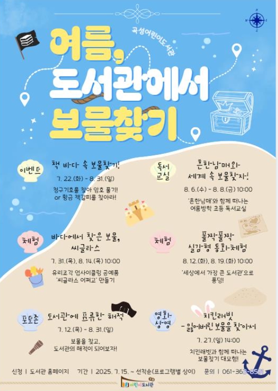 [뉴스시대=김정희 기자] 곡성군은 여름방학 기간인 오는 7월 22일부터 8월 31일까지 ‘여름, 도서관에서 보물찾기”라는 주제로 곡성어린이도서관에서 지역민을 위한 다양한 독서문화 행사를 운영한다고 14일 전했다.