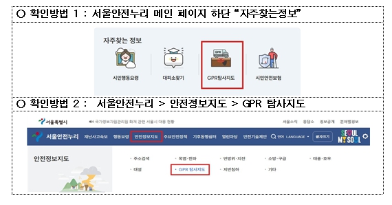 ▲ 서울안전누리 내‘GPR 탐사지도’메뉴 확인 방법 |